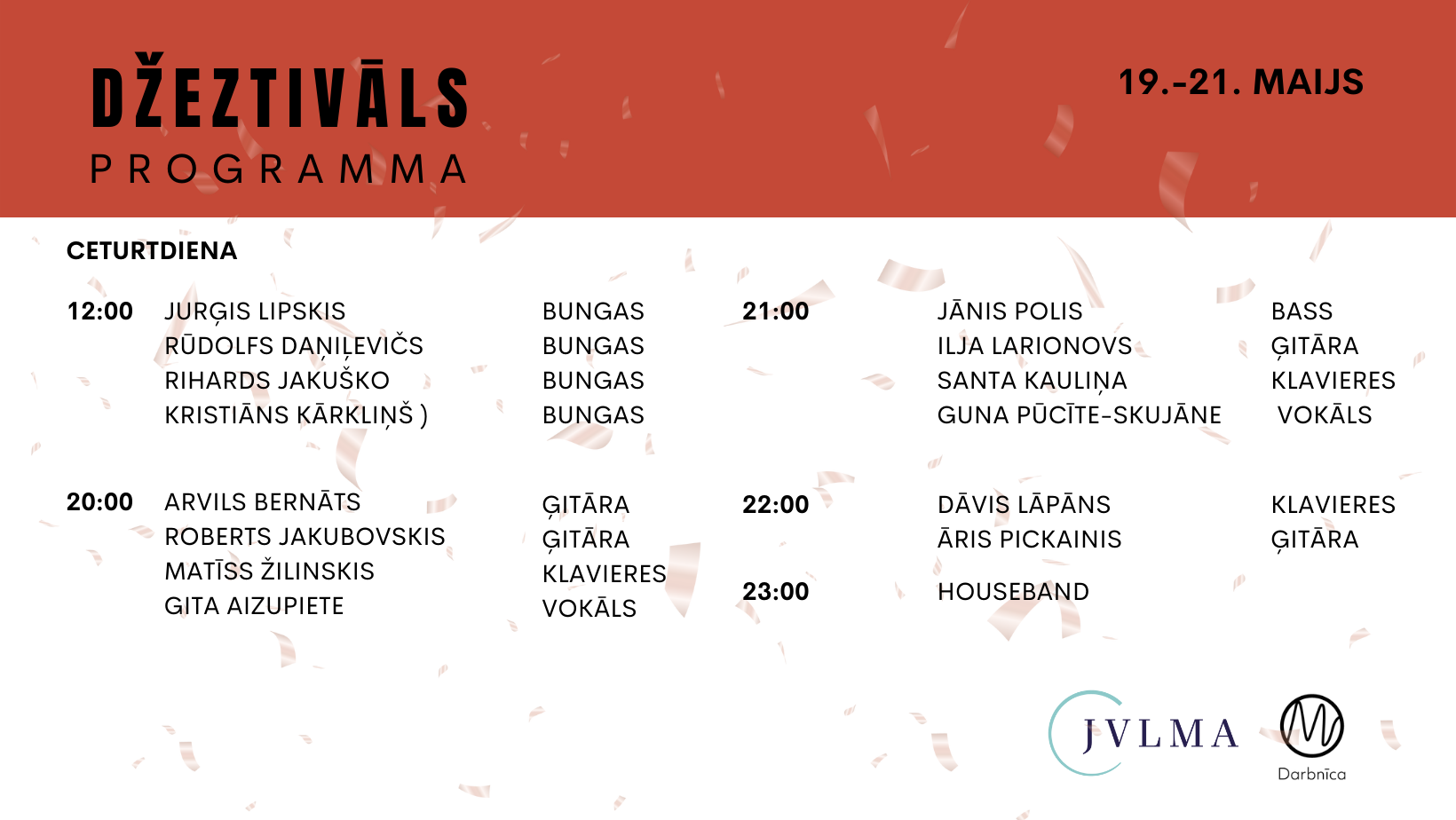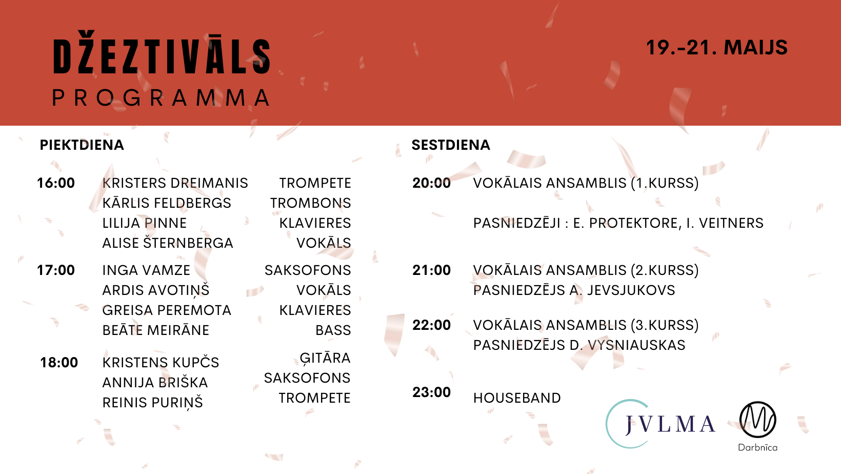 No ceturtdienas līdz sestdienai kultūras un mūzikas norises vietā "M/Darbnīca" (Fon Stricka villas teritorijā A. Briāna ielā 9, Rīgā) izskanēs Jāzepa Vītola Latvijas Mūzikas akadēmijas Džeza nodaļas studentu eksāmenu koncerti.
