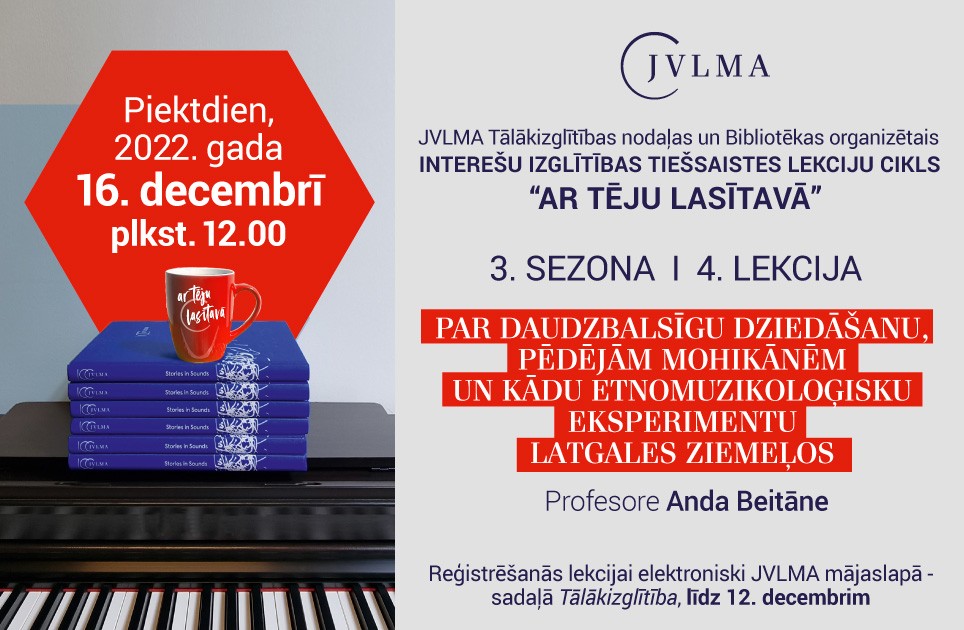 16. decembrī plkst. 12.00 platformā “Zoom” aicinām uz 3. sezonas 4. tiešsaistes cikla "Ar tēju lasītavā" lekciju "Par daudzbalsīgu dziedāšanu, pēdējām mohikānēm un kādu etnomuzikoloģisku eksperimentu Latgales ziemeļos". prof. Andas Beitānes vadībā.